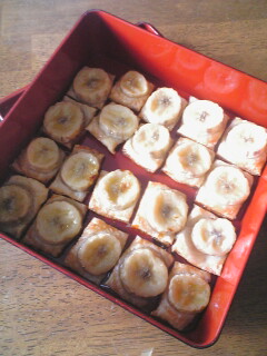 凍ってる生地にマーガリンを塗って、スライスしたバナナ、林檎をちりばめて、