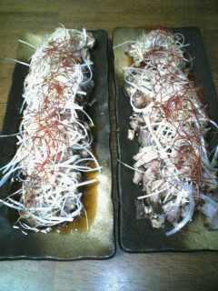 4、薄くスライスして漬け汁をかけ、白髪ねぎ(面倒な時は斜め薄切り)をのせ、上に糸唐辛子で色づけでのせるv