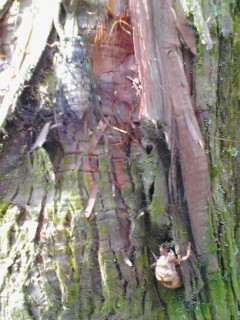 左上に羽化して数時間たった蝉。右下に脱け殻。