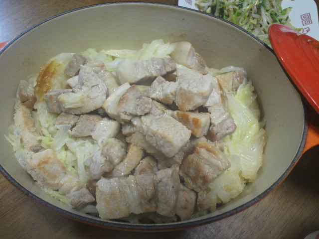 ●がっちり蓋して弱火でクツクツ。白菜から出る水分で十分ですが、心配なら